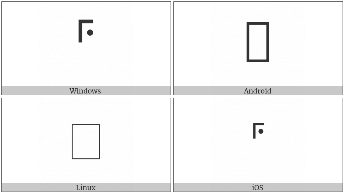 The image below shows how the “Right Angle Dotted Substitution Marker” symbol might look like on different operating systems. If the font in which this web site is displayed does not contain the symbol and there is no fallback font able to render it, you can use the image below to get an idea of what it should look like.