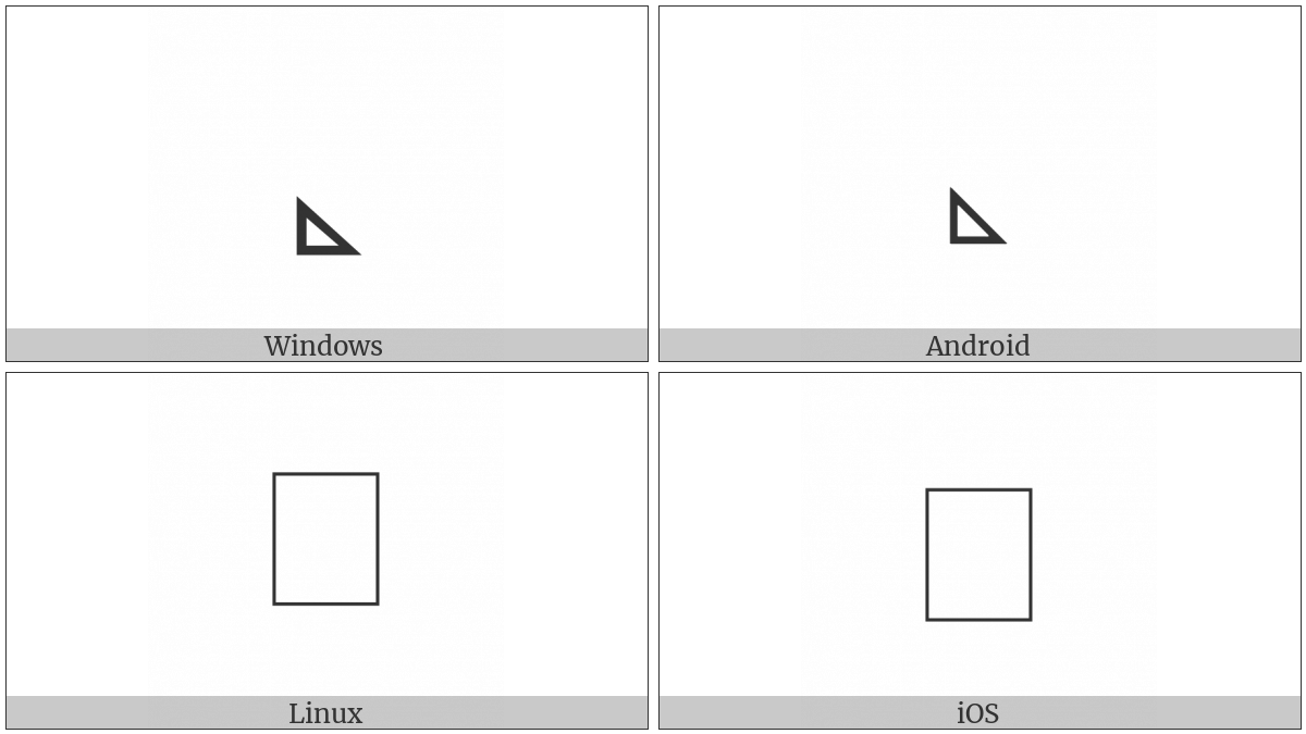 The image below shows how the “Musical Symbol Triangle Notehead Left White” symbol might look like on different operating systems. If the font in which this web site is displayed does not contain the symbol and there is no fallback font able to render it, you can use the image below to get an idea of what it should look like.