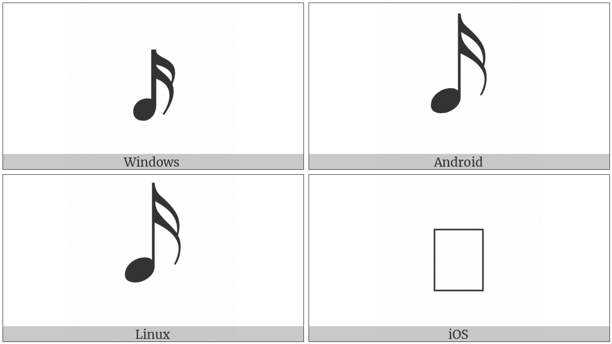 The image below shows how the “Musical Symbol Sixteenth Note” symbol might look like on different operating systems. If the font in which this web site is displayed does not contain the symbol and there is no fallback font able to render it, you can use the image below to get an idea of what it should look like.