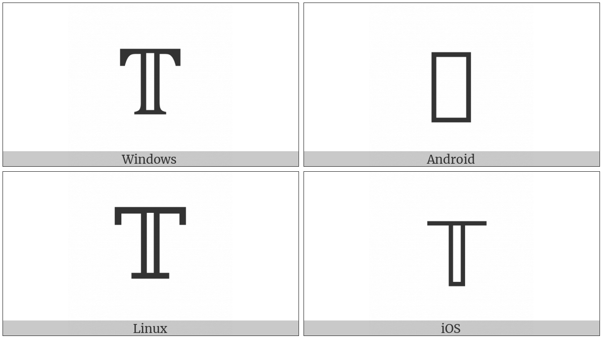 The image below shows how the “Mathematical Double-Struck Capital T” symbol might look like on different operating systems. If the font in which this web site is displayed does not contain the symbol and there is no fallback font able to render it, you can use the image below to get an idea of what it should look like.