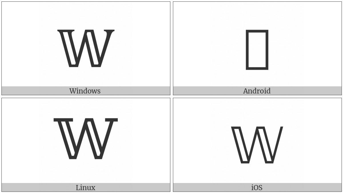 The image below shows how the “Mathematical Double-Struck Capital W” symbol might look like on different operating systems. If the font in which this web site is displayed does not contain the symbol and there is no fallback font able to render it, you can use the image below to get an idea of what it should look like.