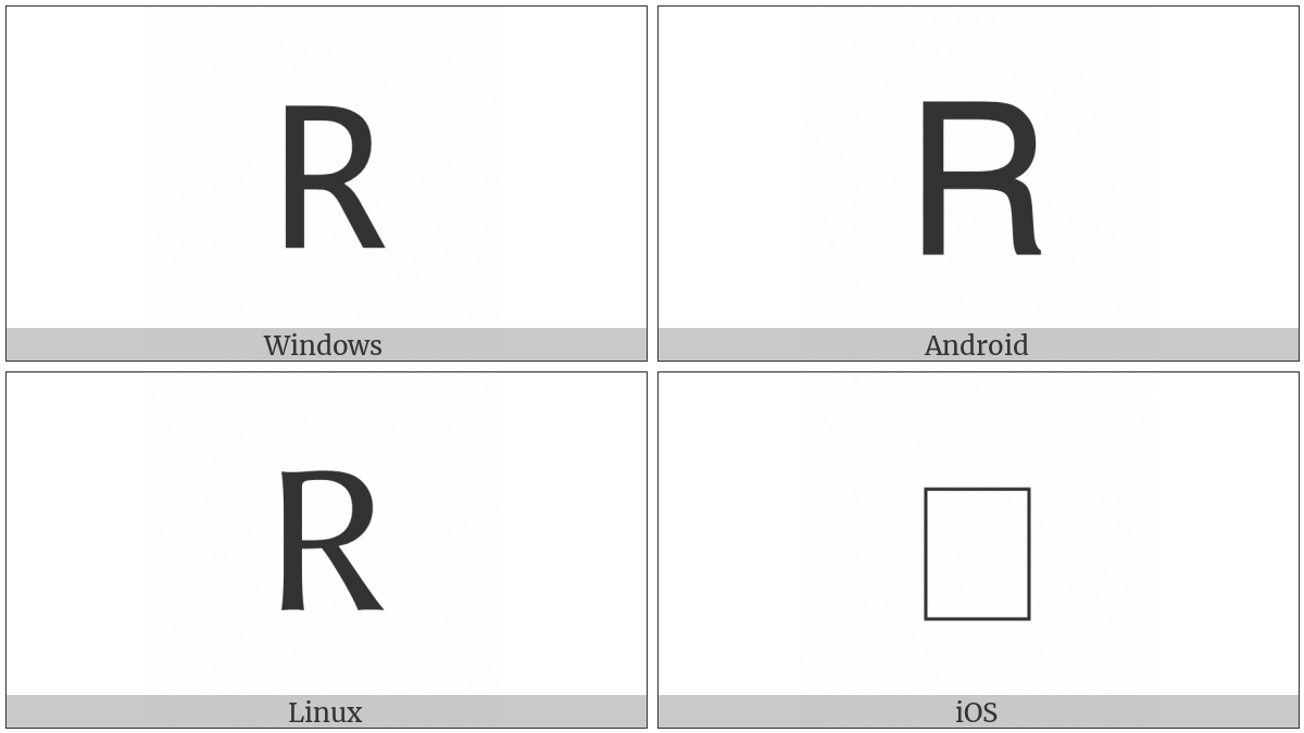 The image below shows how the “Mathematical Sans-Serif Capital R” symbol might look like on different operating systems. If the font in which this web site is displayed does not contain the symbol and there is no fallback font able to render it, you can use the image below to get an idea of what it should look like.