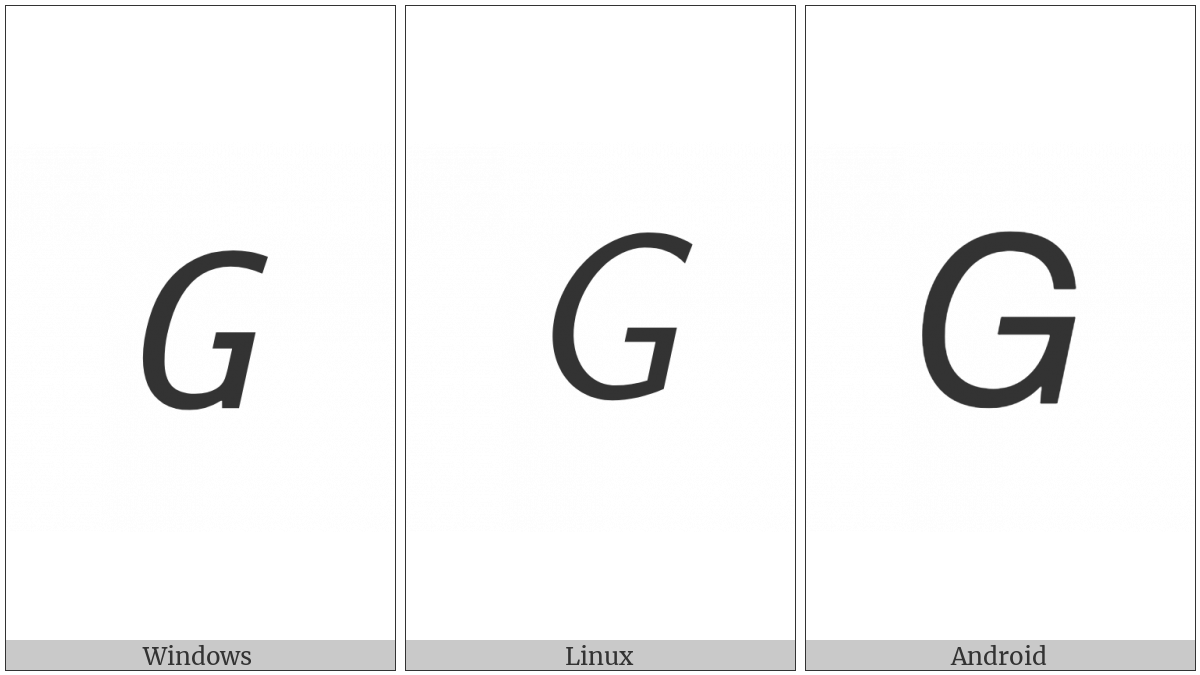 The image below shows how the “Mathematical Sans-Serif Italic Capital G” symbol might look like on different operating systems. If the font in which this web site is displayed does not contain the symbol and there is no fallback font able to render it, you can use the image below to get an idea of what it should look like.