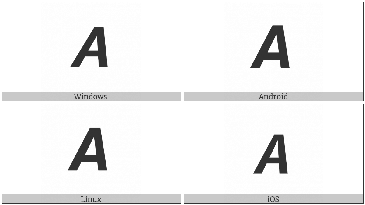 The image below shows how the “Mathematical Sans-Serif Bold Italic Capital A” symbol might look like on different operating systems. If the font in which this web site is displayed does not contain the symbol and there is no fallback font able to render it, you can use the image below to get an idea of what it should look like.