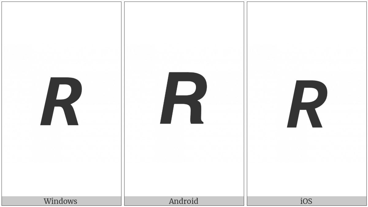 The image below shows how the “Mathematical Sans-Serif Bold Italic Capital R” symbol might look like on different operating systems. If the font in which this web site is displayed does not contain the symbol and there is no fallback font able to render it, you can use the image below to get an idea of what it should look like.