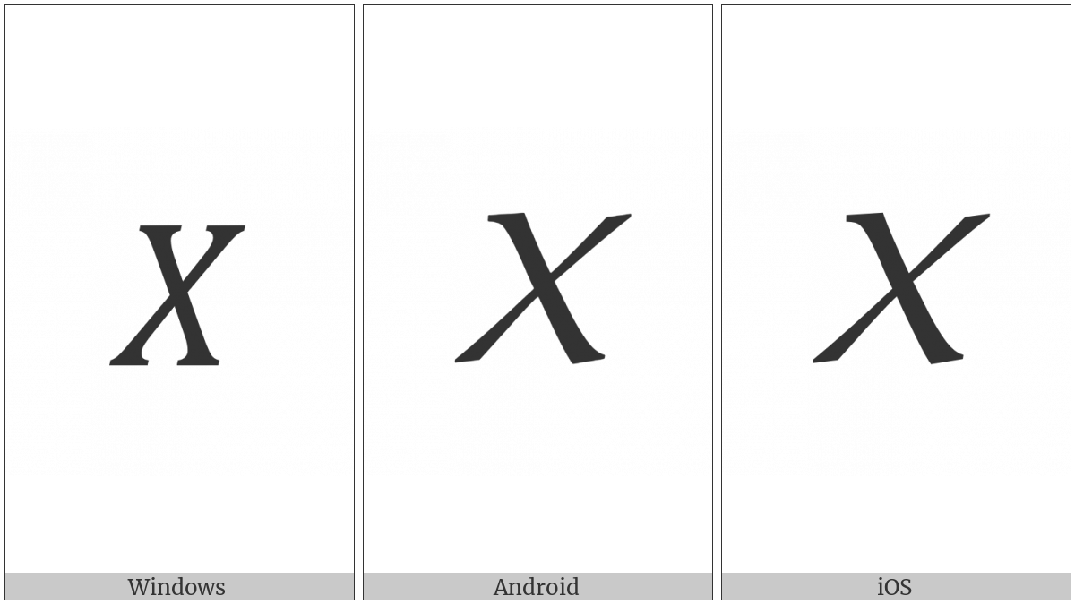The image below shows how the “Mathematical Italic Capital Chi” symbol might look like on different operating systems. If the font in which this web site is displayed does not contain the symbol and there is no fallback font able to render it, you can use the image below to get an idea of what it should look like.