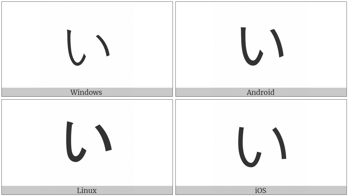 The image below shows how the “Hiragana Letter I” symbol might look like on different operating systems. If the font in which this web site is displayed does not contain the symbol and there is no fallback font able to render it, you can use the image below to get an idea of what it should look like.