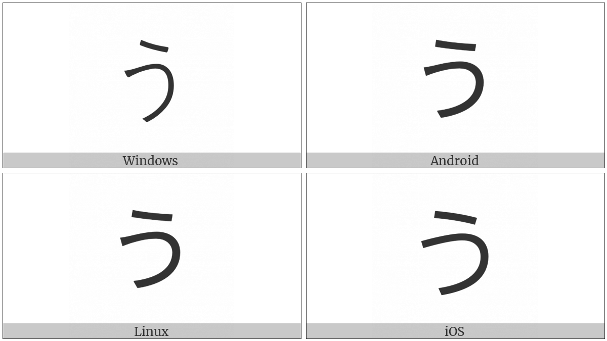 The image below shows how the “Hiragana Letter U” symbol might look like on different operating systems. If the font in which this web site is displayed does not contain the symbol and there is no fallback font able to render it, you can use the image below to get an idea of what it should look like.