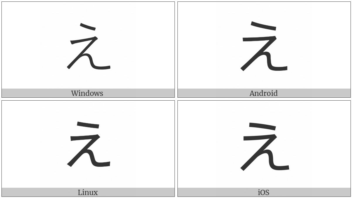 The image below shows how the “Hiragana Letter E” symbol might look like on different operating systems. If the font in which this web site is displayed does not contain the symbol and there is no fallback font able to render it, you can use the image below to get an idea of what it should look like.
