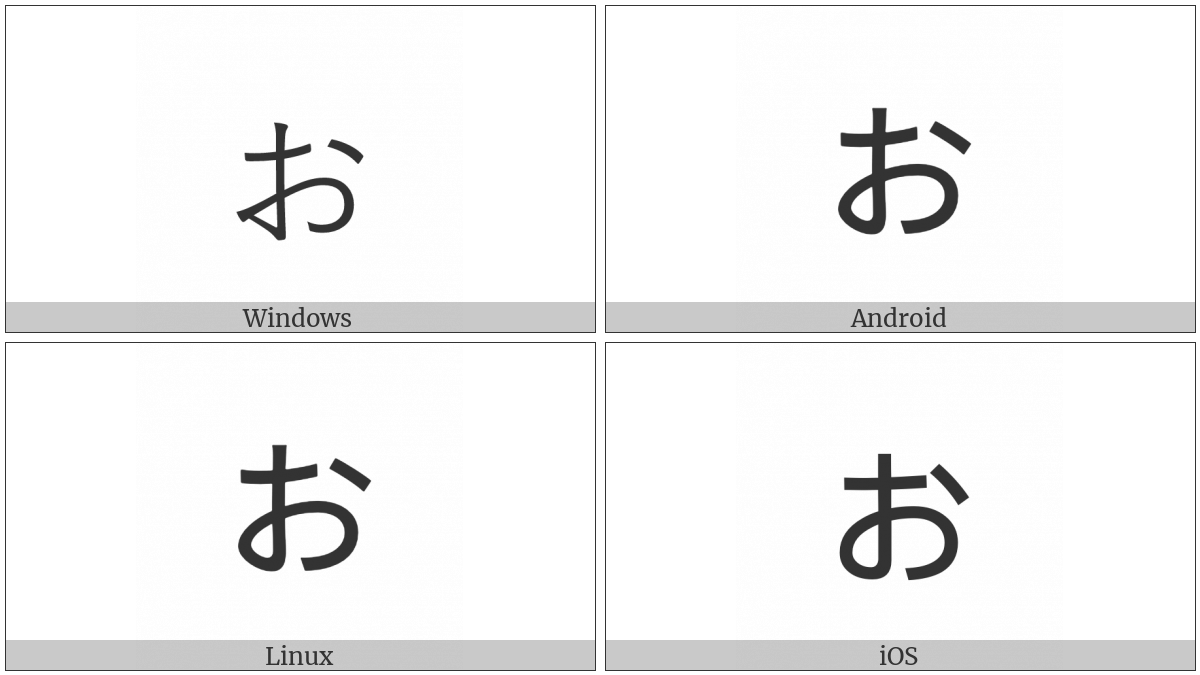 “Hiragana Letter Small O” on various operating systems