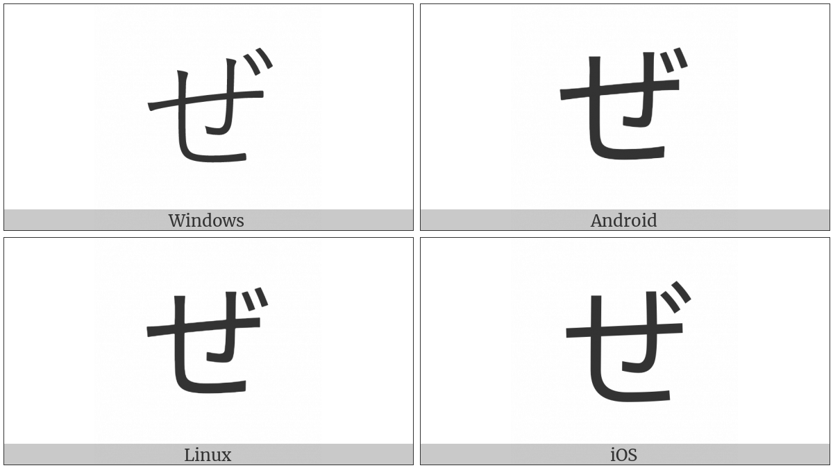 The image below shows how the “Hiragana Letter Ze” symbol might look like on different operating systems. If the font in which this web site is displayed does not contain the symbol and there is no fallback font able to render it, you can use the image below to get an idea of what it should look like.
