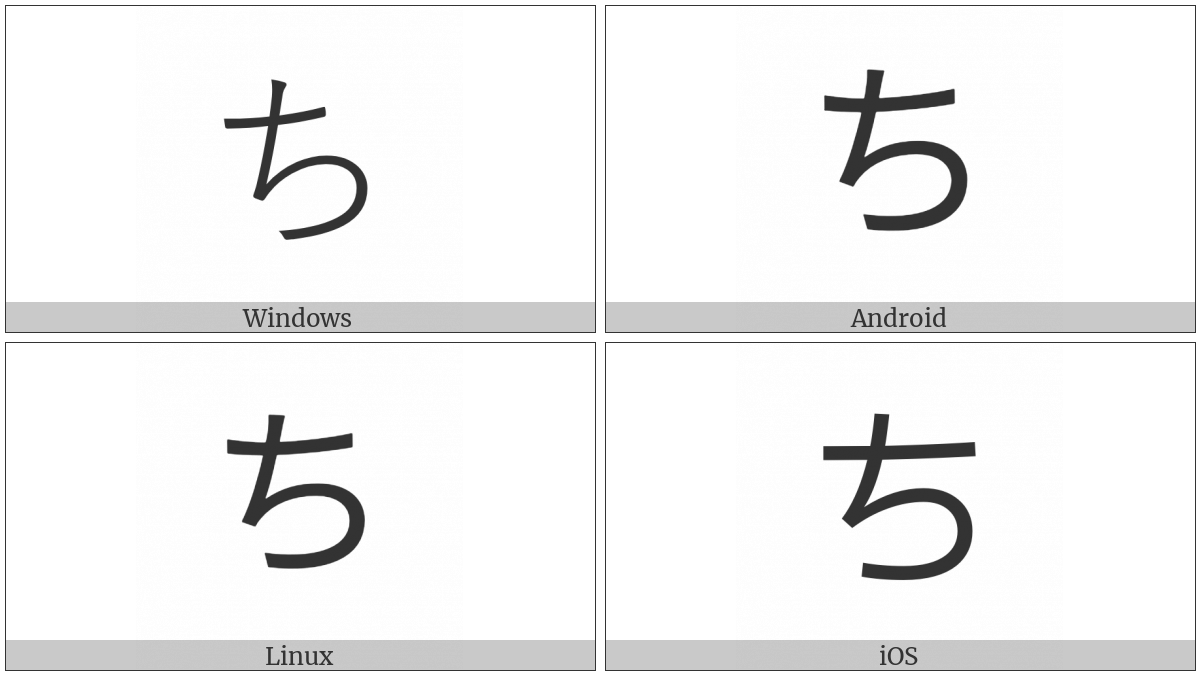 The image below shows how the “Hiragana Letter Ti” symbol might look like on different operating systems. If the font in which this web site is displayed does not contain the symbol and there is no fallback font able to render it, you can use the image below to get an idea of what it should look like.