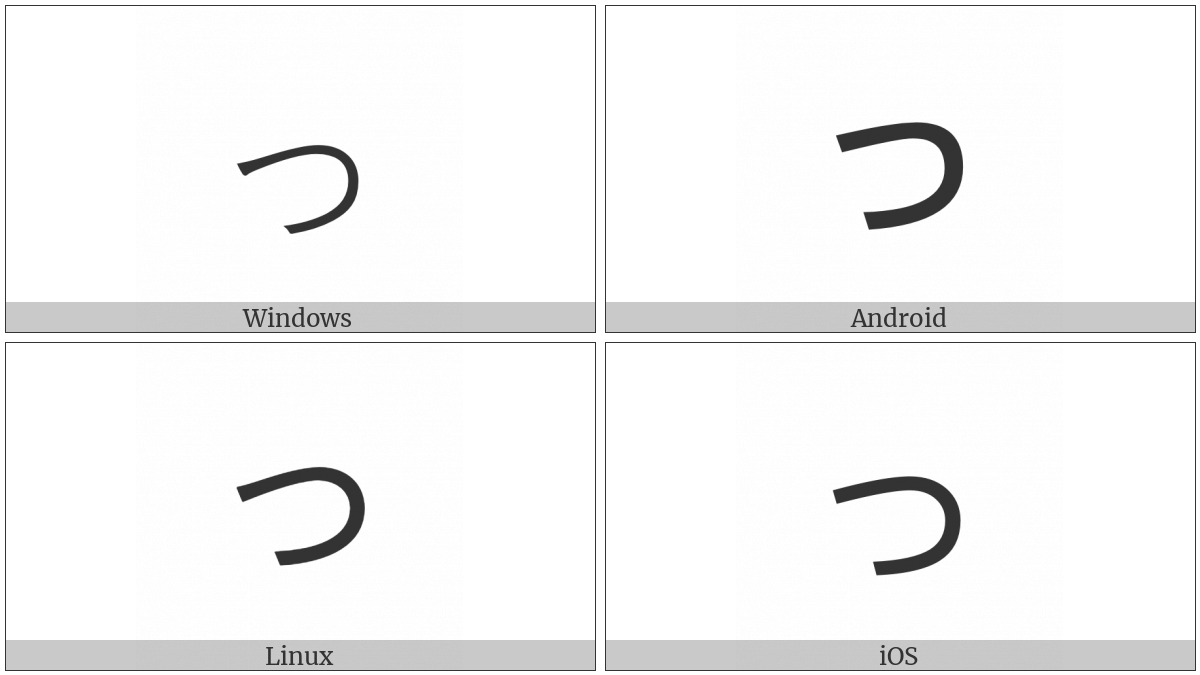 The image below shows how the “Hiragana Letter Small Tu” symbol might look like on different operating systems. If the font in which this web site is displayed does not contain the symbol and there is no fallback font able to render it, you can use the image below to get an idea of what it should look like.