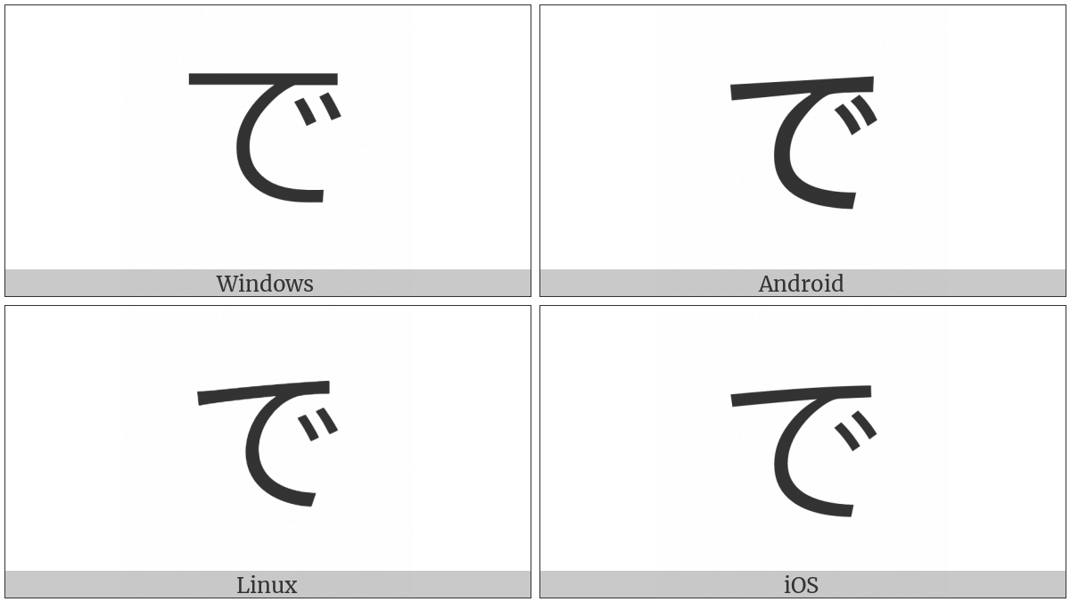 The image below shows how the “Hiragana Letter De” symbol might look like on different operating systems. If the font in which this web site is displayed does not contain the symbol and there is no fallback font able to render it, you can use the image below to get an idea of what it should look like.