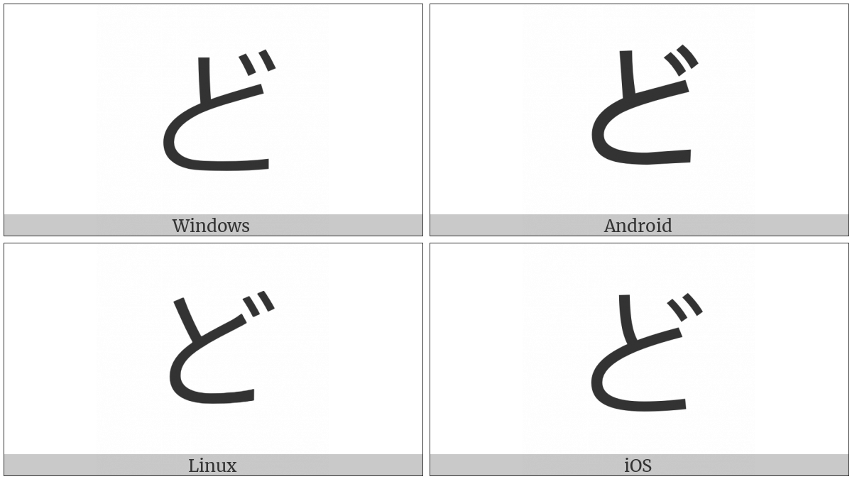 The image below shows how the “Hiragana Letter Do” symbol might look like on different operating systems. If the font in which this web site is displayed does not contain the symbol and there is no fallback font able to render it, you can use the image below to get an idea of what it should look like.