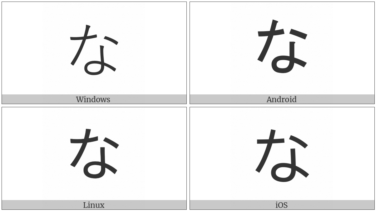 The image below shows how the “Hiragana Letter Na” symbol might look like on different operating systems. If the font in which this web site is displayed does not contain the symbol and there is no fallback font able to render it, you can use the image below to get an idea of what it should look like.