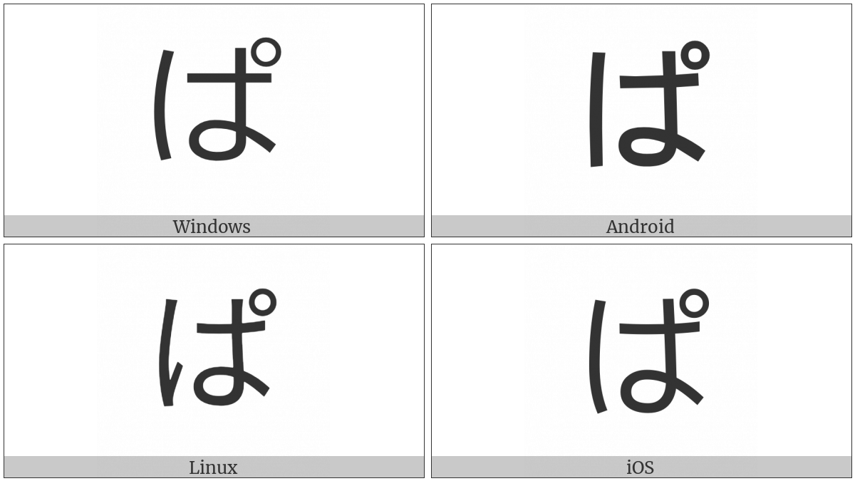 The image below shows how the “Hiragana Letter Pa” symbol might look like on different operating systems. If the font in which this web site is displayed does not contain the symbol and there is no fallback font able to render it, you can use the image below to get an idea of what it should look like.