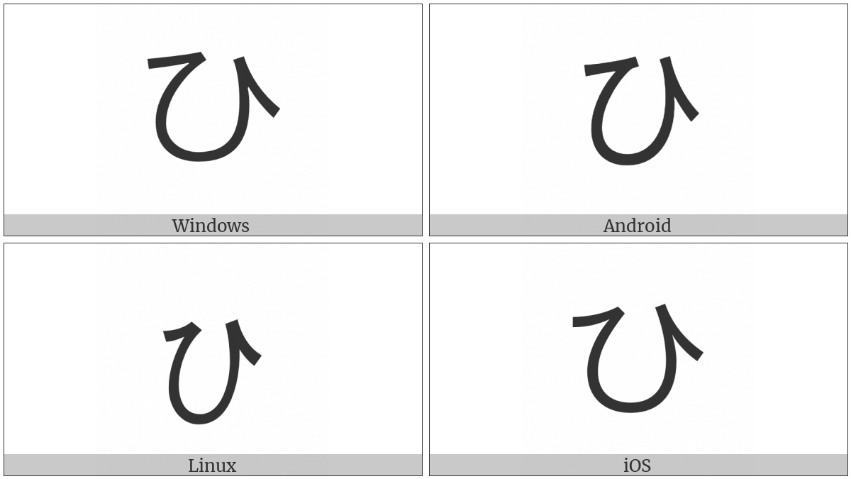 The image below shows how the “Hiragana Letter Hi” symbol might look like on different operating systems. If the font in which this web site is displayed does not contain the symbol and there is no fallback font able to render it, you can use the image below to get an idea of what it should look like.