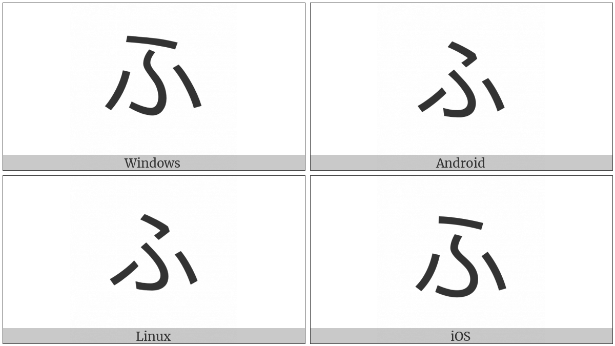 The image below shows how the “Hiragana Letter Hu” symbol might look like on different operating systems. If the font in which this web site is displayed does not contain the symbol and there is no fallback font able to render it, you can use the image below to get an idea of what it should look like.
