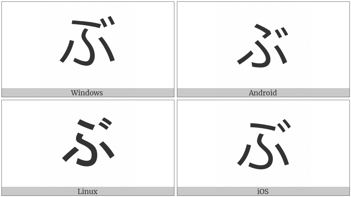 The image below shows how the “Hiragana Letter Bu” symbol might look like on different operating systems. If the font in which this web site is displayed does not contain the symbol and there is no fallback font able to render it, you can use the image below to get an idea of what it should look like.