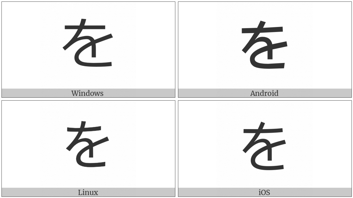 The image below shows how the “Hiragana Letter Wo” symbol might look like on different operating systems. If the font in which this web site is displayed does not contain the symbol and there is no fallback font able to render it, you can use the image below to get an idea of what it should look like.