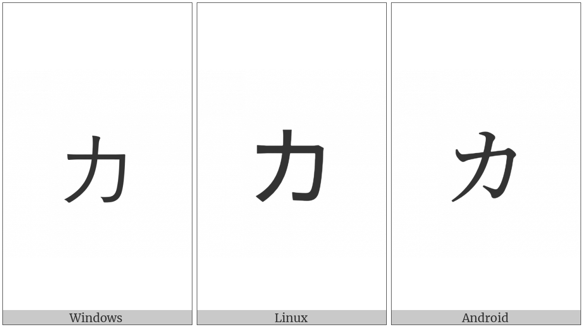 The image below shows how the “Katakana Letter Small Ka” symbol might look like on different operating systems. If the font in which this web site is displayed does not contain the symbol and there is no fallback font able to render it, you can use the image below to get an idea of what it should look like.