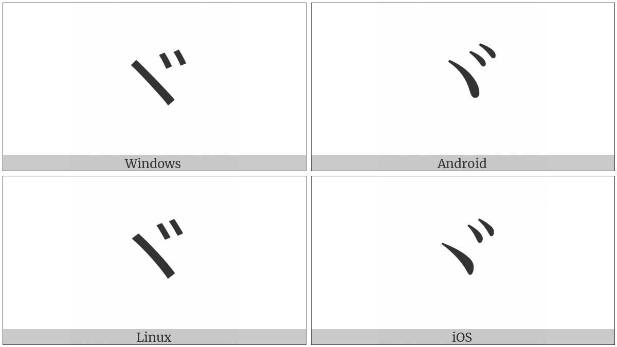 The image below shows how the “Katakana Voiced Iteration Mark” symbol might look like on different operating systems. If the font in which this web site is displayed does not contain the symbol and there is no fallback font able to render it, you can use the image below to get an idea of what it should look like.