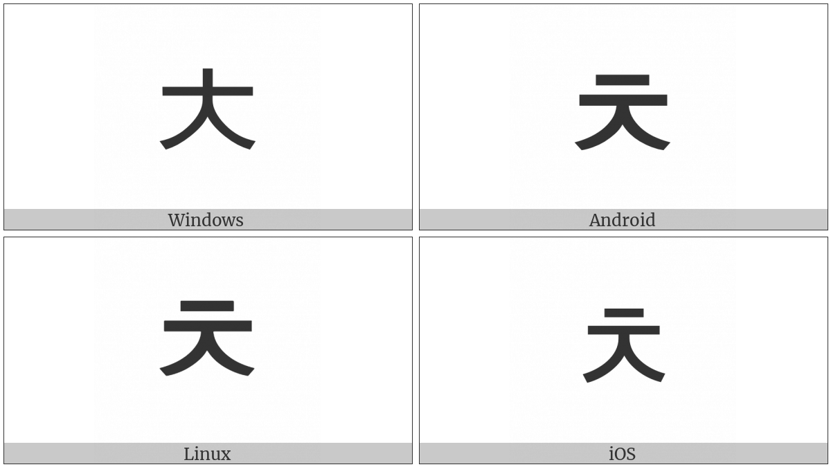 The image below shows how the “Hangul Letter Chieuch” symbol might look like on different operating systems. If the font in which this web site is displayed does not contain the symbol and there is no fallback font able to render it, you can use the image below to get an idea of what it should look like.