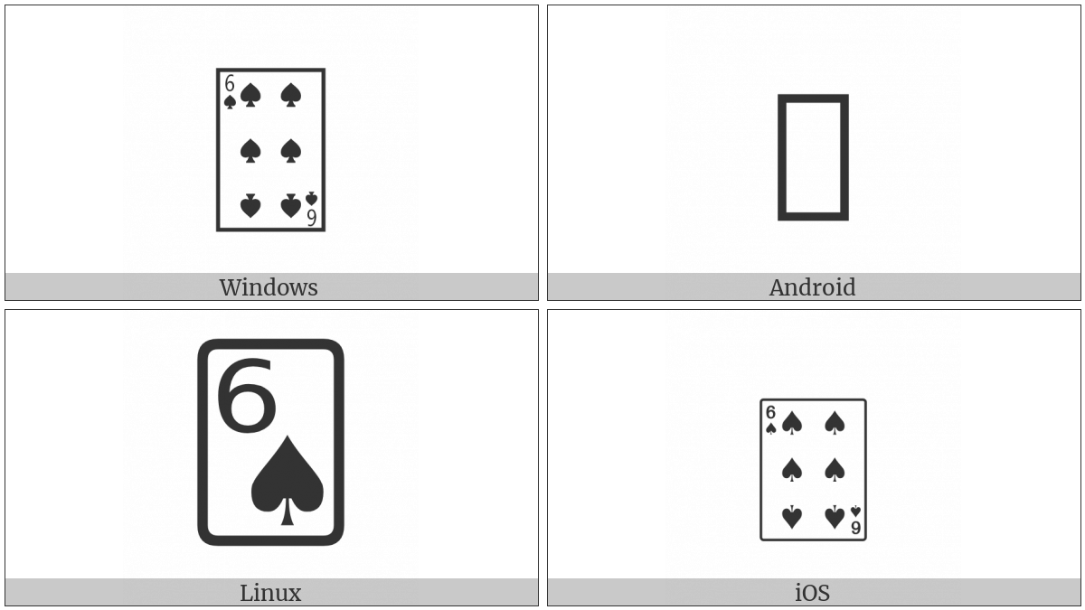The image below shows how the “Playing Card Six Of Spades” symbol might look like on different operating systems. If the font in which this web site is displayed does not contain the symbol and there is no fallback font able to render it, you can use the image below to get an idea of what it should look like.