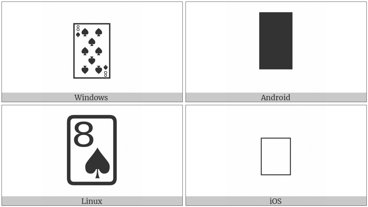 The image below shows how the “Playing Card Eight Of Spades” symbol might look like on different operating systems. If the font in which this web site is displayed does not contain the symbol and there is no fallback font able to render it, you can use the image below to get an idea of what it should look like.