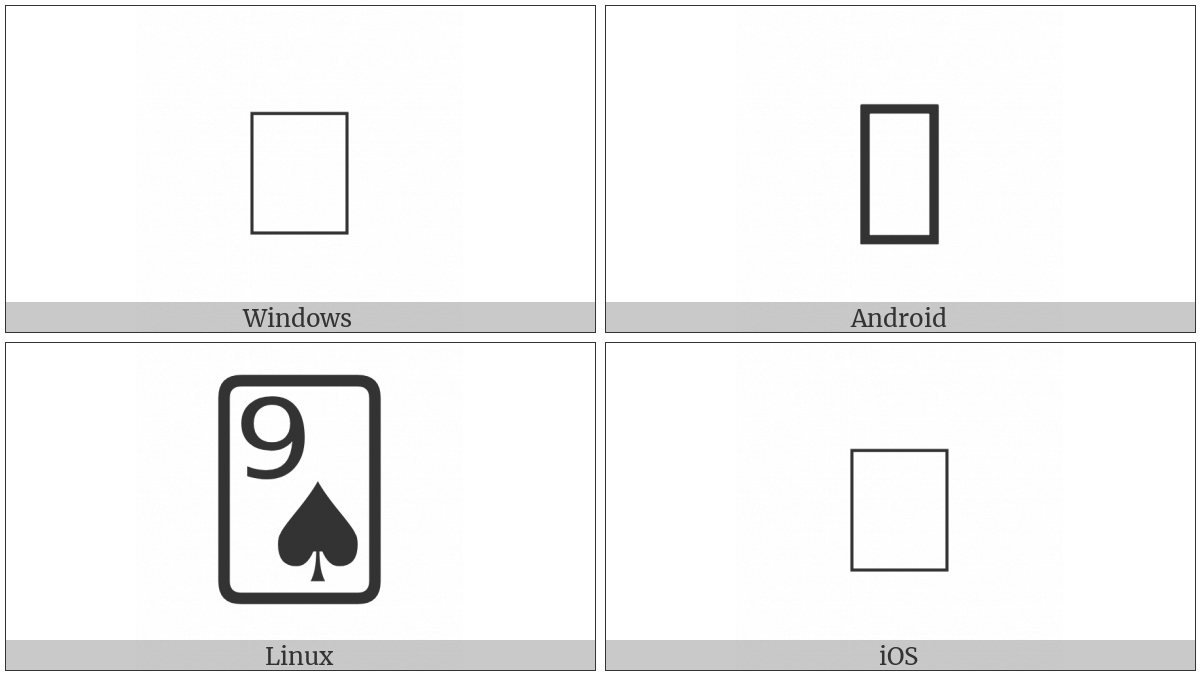 The image below shows how the “Playing Card Nine Of Spades” symbol might look like on different operating systems. If the font in which this web site is displayed does not contain the symbol and there is no fallback font able to render it, you can use the image below to get an idea of what it should look like.