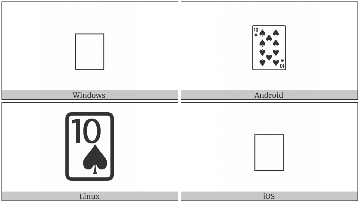 The image below shows how the “Playing Card Ten Of Spades” symbol might look like on different operating systems. If the font in which this web site is displayed does not contain the symbol and there is no fallback font able to render it, you can use the image below to get an idea of what it should look like.