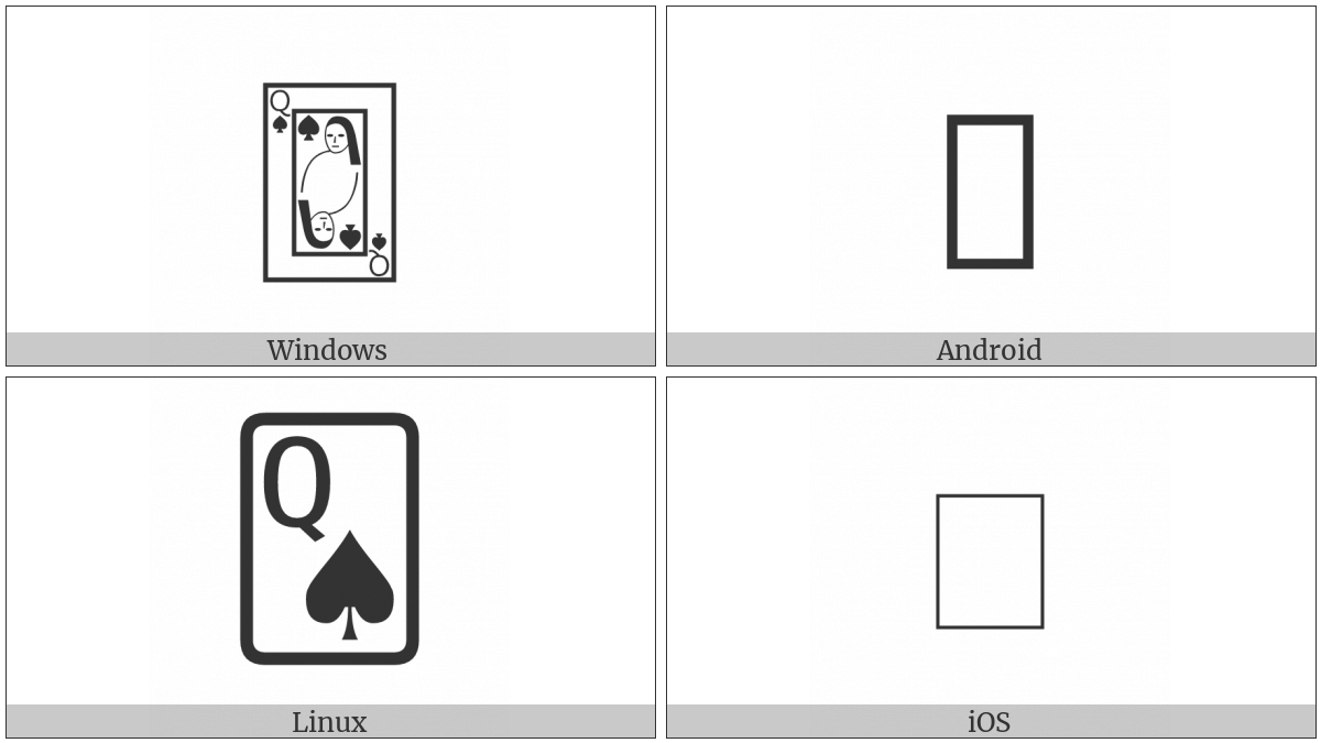 The image below shows how the “Playing Card Queen Of Spades” symbol might look like on different operating systems. If the font in which this web site is displayed does not contain the symbol and there is no fallback font able to render it, you can use the image below to get an idea of what it should look like.