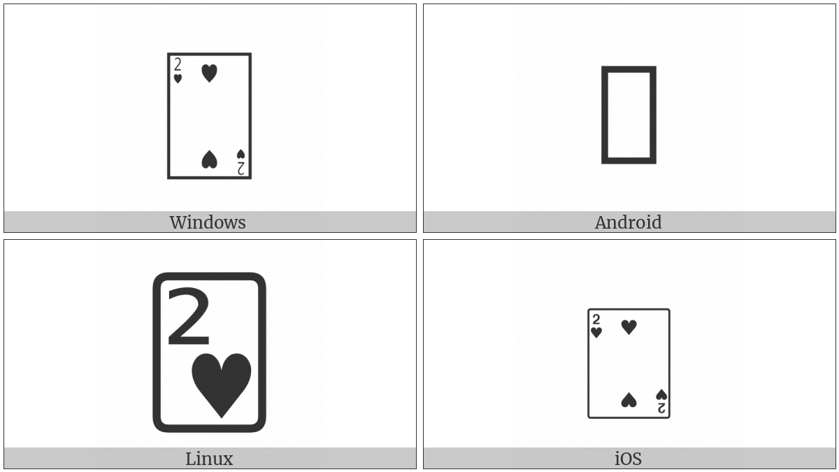 The image below shows how the “Playing Card Two Of Hearts” symbol might look like on different operating systems. If the font in which this web site is displayed does not contain the symbol and there is no fallback font able to render it, you can use the image below to get an idea of what it should look like.