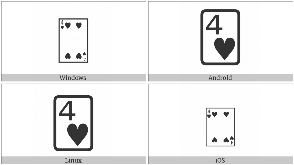 The image below shows how the “Playing Card Four Of Hearts” symbol might look like on different operating systems. If the font in which this web site is displayed does not contain the symbol and there is no fallback font able to render it, you can use the image below to get an idea of what it should look like.