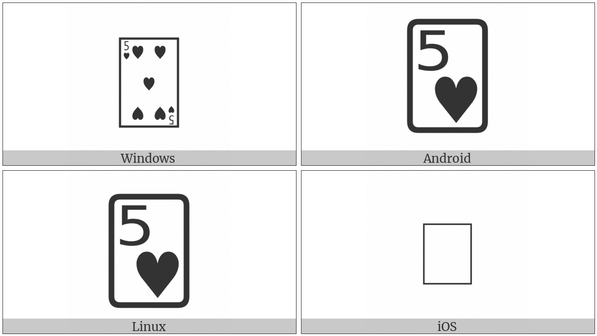 The image below shows how the “Playing Card Five Of Hearts” symbol might look like on different operating systems. If the font in which this web site is displayed does not contain the symbol and there is no fallback font able to render it, you can use the image below to get an idea of what it should look like.