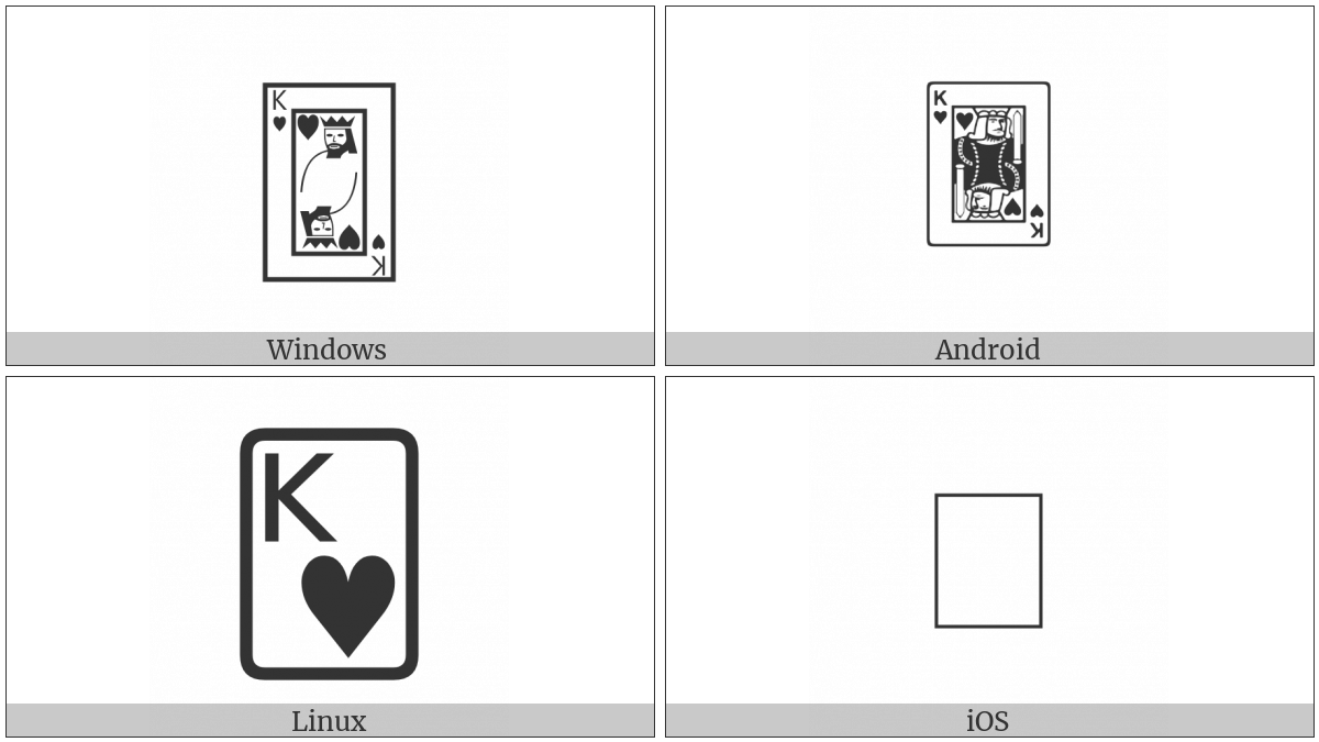 The image below shows how the “Playing Card King Of Hearts” symbol might look like on different operating systems. If the font in which this web site is displayed does not contain the symbol and there is no fallback font able to render it, you can use the image below to get an idea of what it should look like.