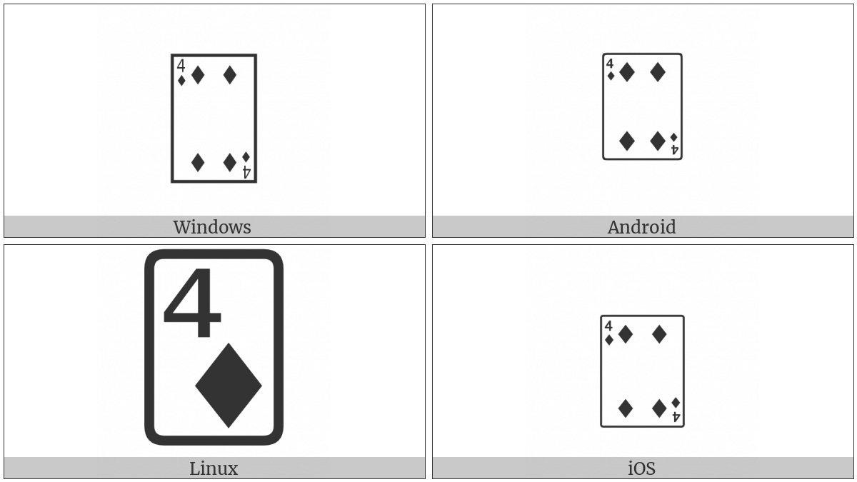 The image below shows how the “Playing Card Four Of Diamonds” symbol might look like on different operating systems. If the font in which this web site is displayed does not contain the symbol and there is no fallback font able to render it, you can use the image below to get an idea of what it should look like.