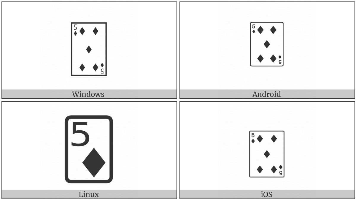 The image below shows how the “Playing Card Five Of Diamonds” symbol might look like on different operating systems. If the font in which this web site is displayed does not contain the symbol and there is no fallback font able to render it, you can use the image below to get an idea of what it should look like.