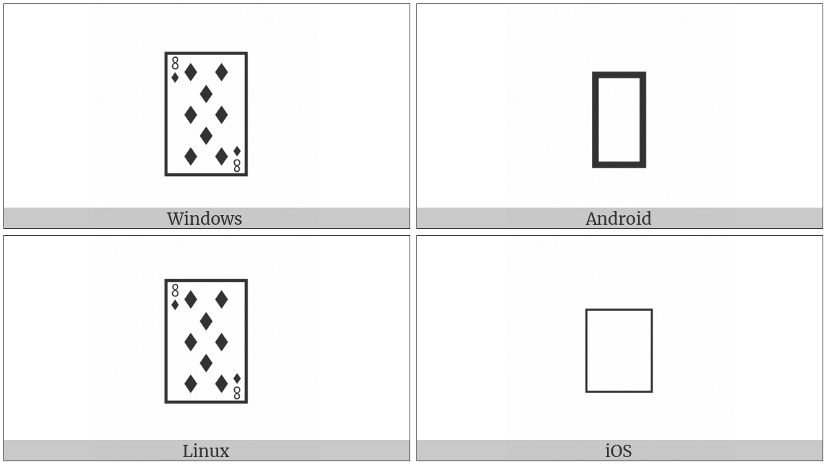 The image below shows how the “Playing Card Eight Of Diamonds” symbol might look like on different operating systems. If the font in which this web site is displayed does not contain the symbol and there is no fallback font able to render it, you can use the image below to get an idea of what it should look like.