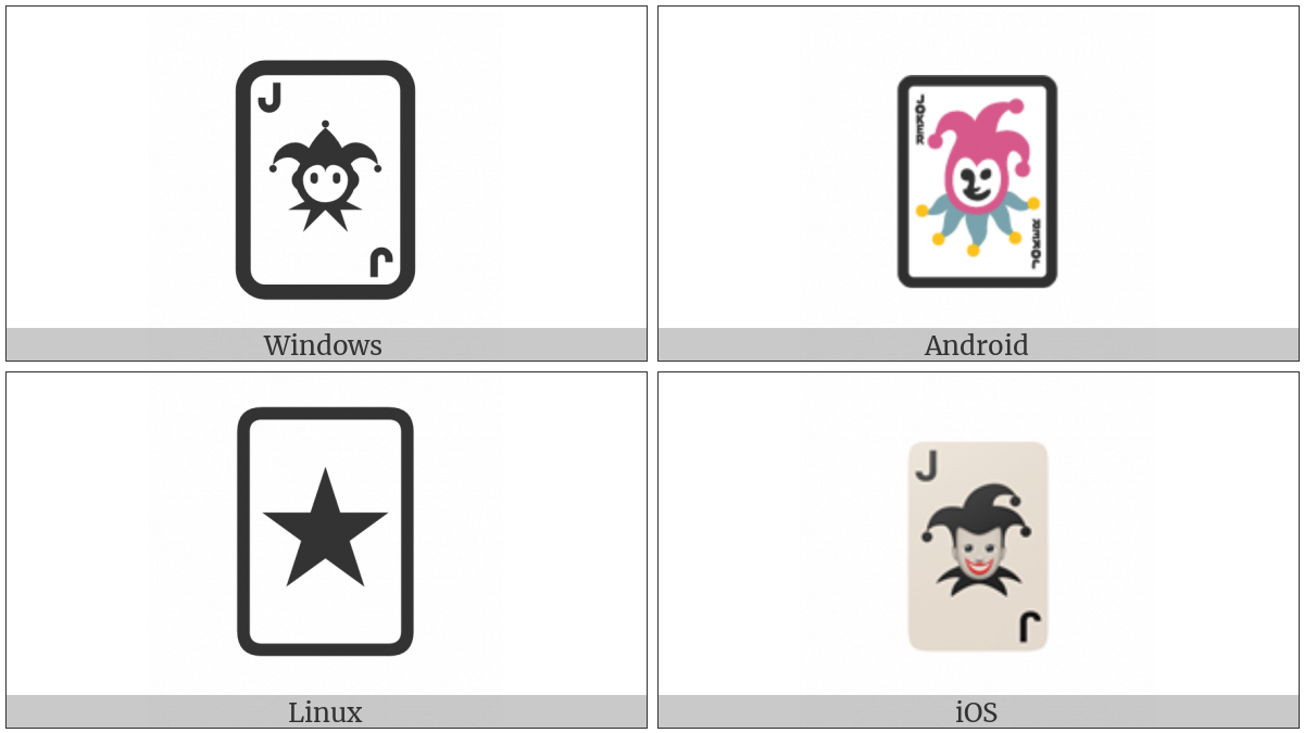 The image below shows how the “Playing Card Black Joker” symbol might look like on different operating systems. If the font in which this web site is displayed does not contain the symbol and there is no fallback font able to render it, you can use the image below to get an idea of what it should look like.