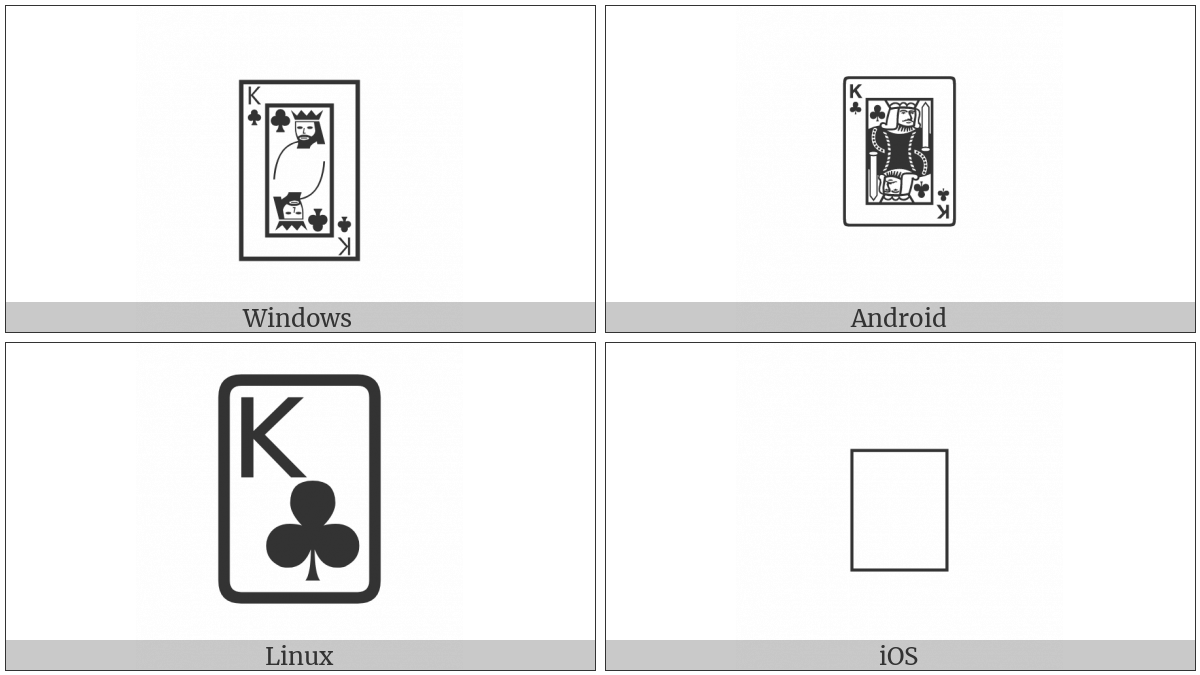 The image below shows how the “Playing Card King Of Clubs” symbol might look like on different operating systems. If the font in which this web site is displayed does not contain the symbol and there is no fallback font able to render it, you can use the image below to get an idea of what it should look like.