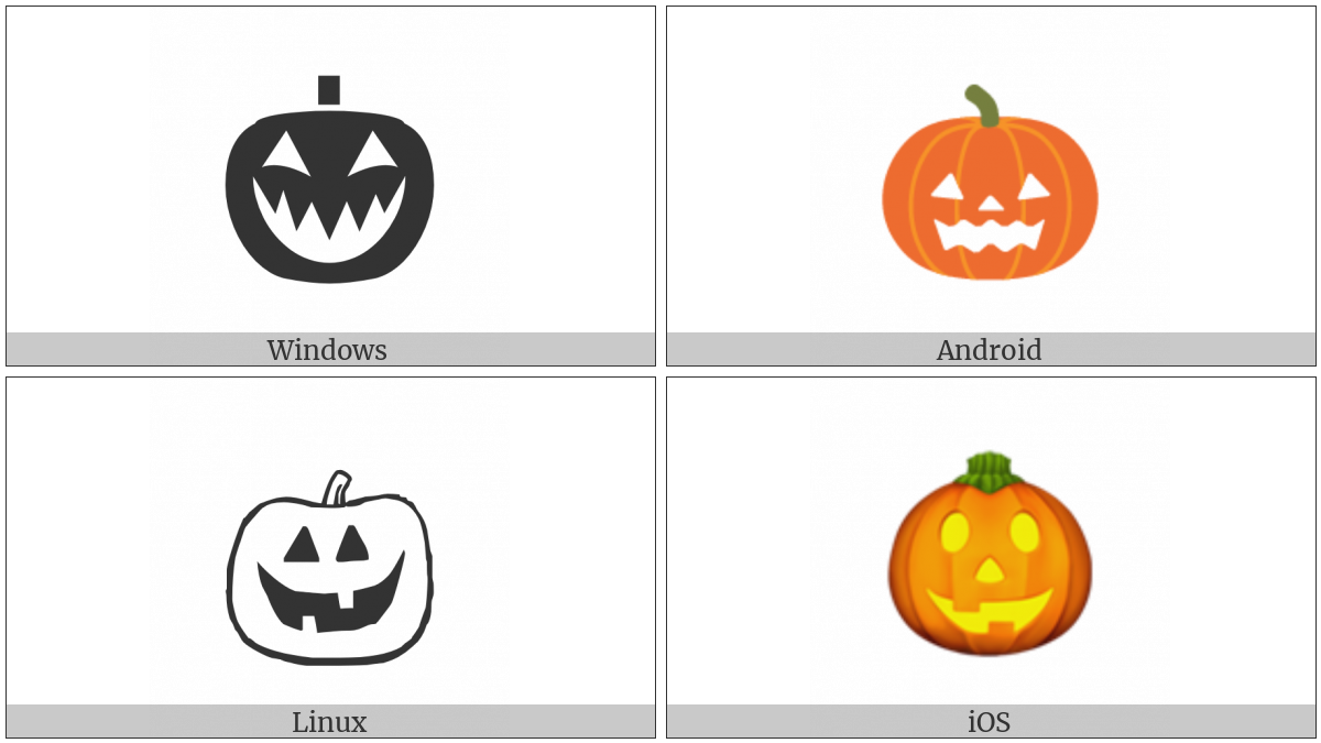 The image below shows how the “Jack-O-Lantern” symbol might look like on different operating systems. If the font in which this web site is displayed does not contain the symbol and there is no fallback font able to render it, you can use the image below to get an idea of what it should look like.