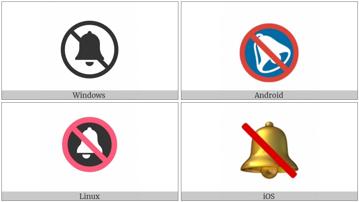 The image below shows how the “Bell With Cancellation Stroke” symbol might look like on different operating systems. If the font in which this web site is displayed does not contain the symbol and there is no fallback font able to render it, you can use the image below to get an idea of what it should look like.