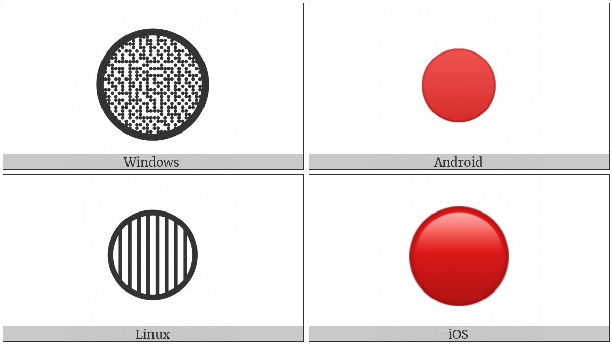 The image below shows how the “Large Red Circle” symbol might look like on different operating systems. If the font in which this web site is displayed does not contain the symbol and there is no fallback font able to render it, you can use the image below to get an idea of what it should look like.