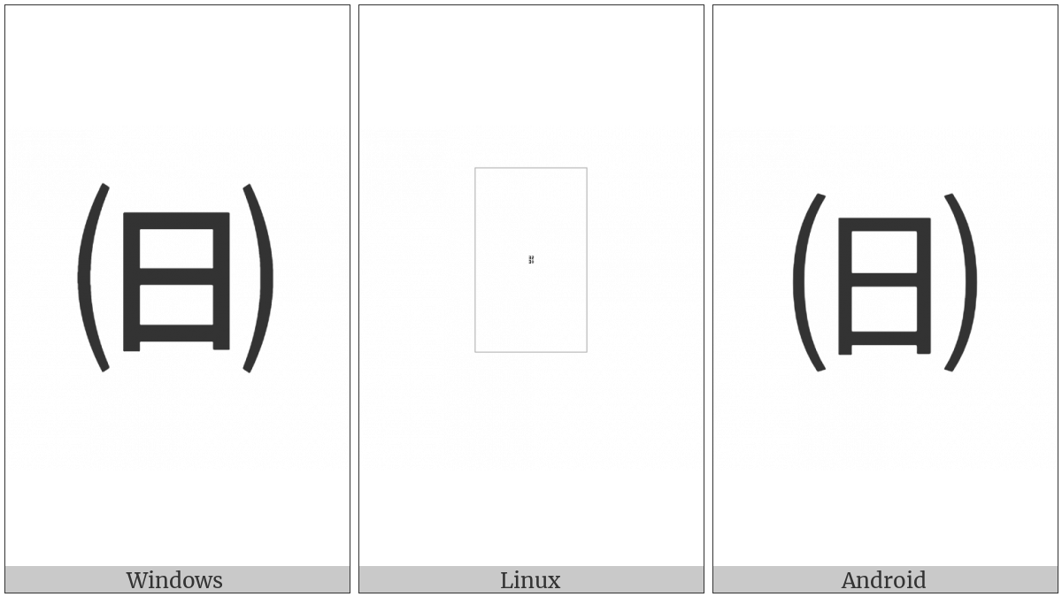 The image below shows how the “Parenthesized Ideograph Sun” symbol might look like on different operating systems. If the font in which this web site is displayed does not contain the symbol and there is no fallback font able to render it, you can use the image below to get an idea of what it should look like.