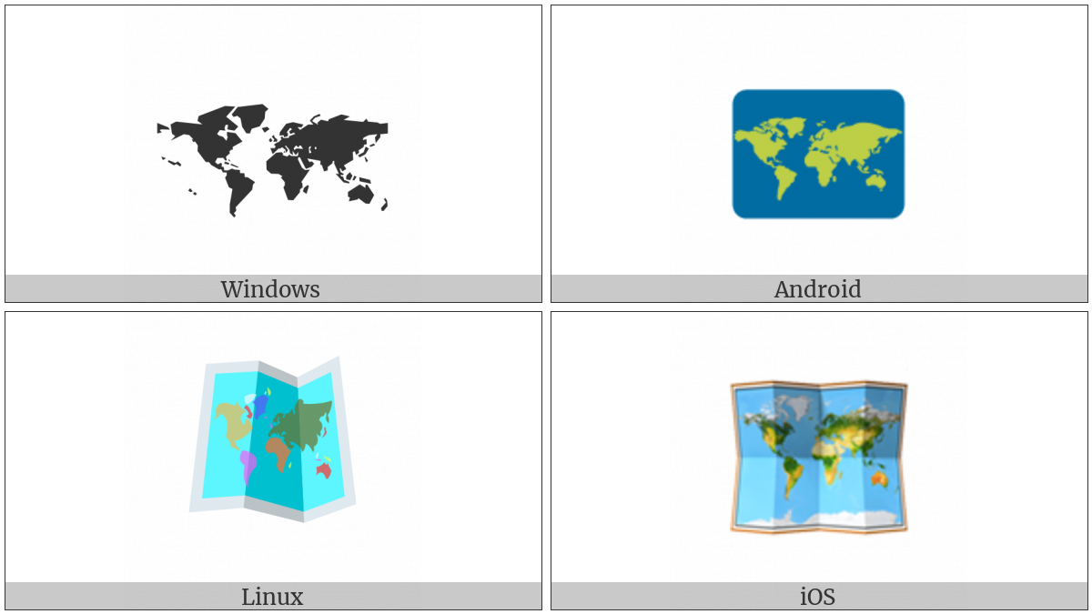 The image below shows how the “World Map” symbol might look like on different operating systems. If the font in which this web site is displayed does not contain the symbol and there is no fallback font able to render it, you can use the image below to get an idea of what it should look like.