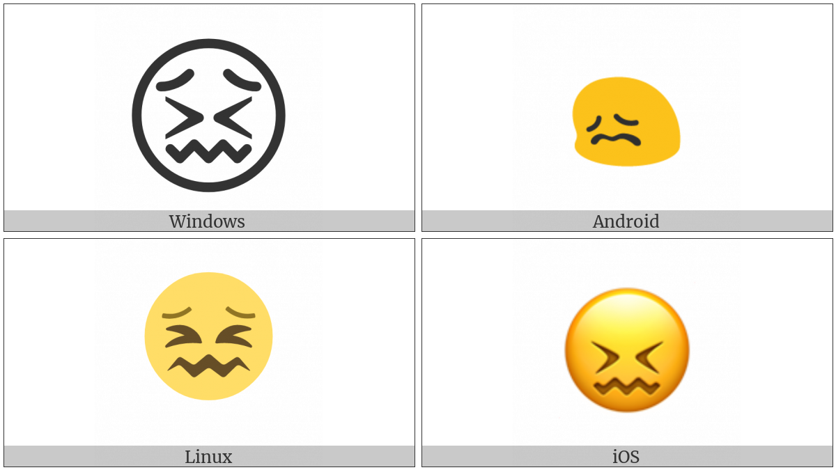 The image below shows how the “Confounded Face” symbol might look like on different operating systems. If the font in which this web site is displayed does not contain the symbol and there is no fallback font able to render it, you can use the image below to get an idea of what it should look like.