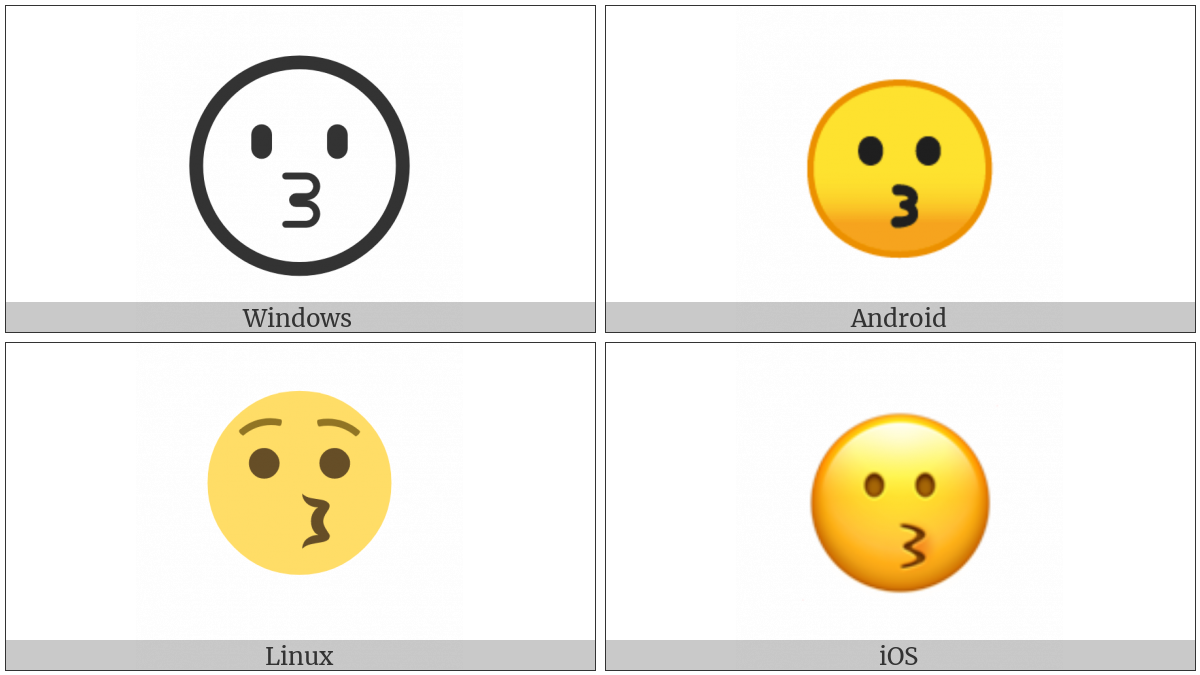 The image below shows how the “Kissing Face” symbol might look like on different operating systems. If the font in which this web site is displayed does not contain the symbol and there is no fallback font able to render it, you can use the image below to get an idea of what it should look like.