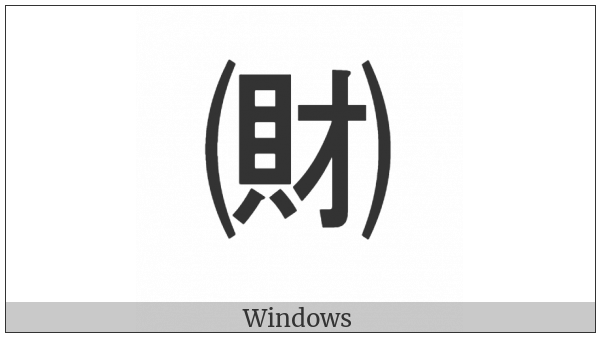 The image below shows how the “Parenthesized Ideograph Financial” symbol might look like on different operating systems. If the font in which this web site is displayed does not contain the symbol and there is no fallback font able to render it, you can use the image below to get an idea of what it should look like.